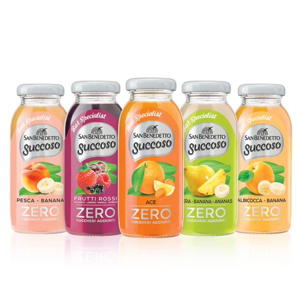 San Benedetto Succoso Zero Bar Specialist è la linea di bevande alla frutta in formato vetro 0,20L. I suoi cinque mix ACE, Pesca/Banana, Frutti Rossi, Pera/Banana/Ananas e Albicocca/Banana, sono ricercati, bilanciati, zero zuccheri aggiunti e con pochissime calorie. Irresistibili mix di frutta per un’esperienza di gusto unica, perfetta in ogni momento della giornata.